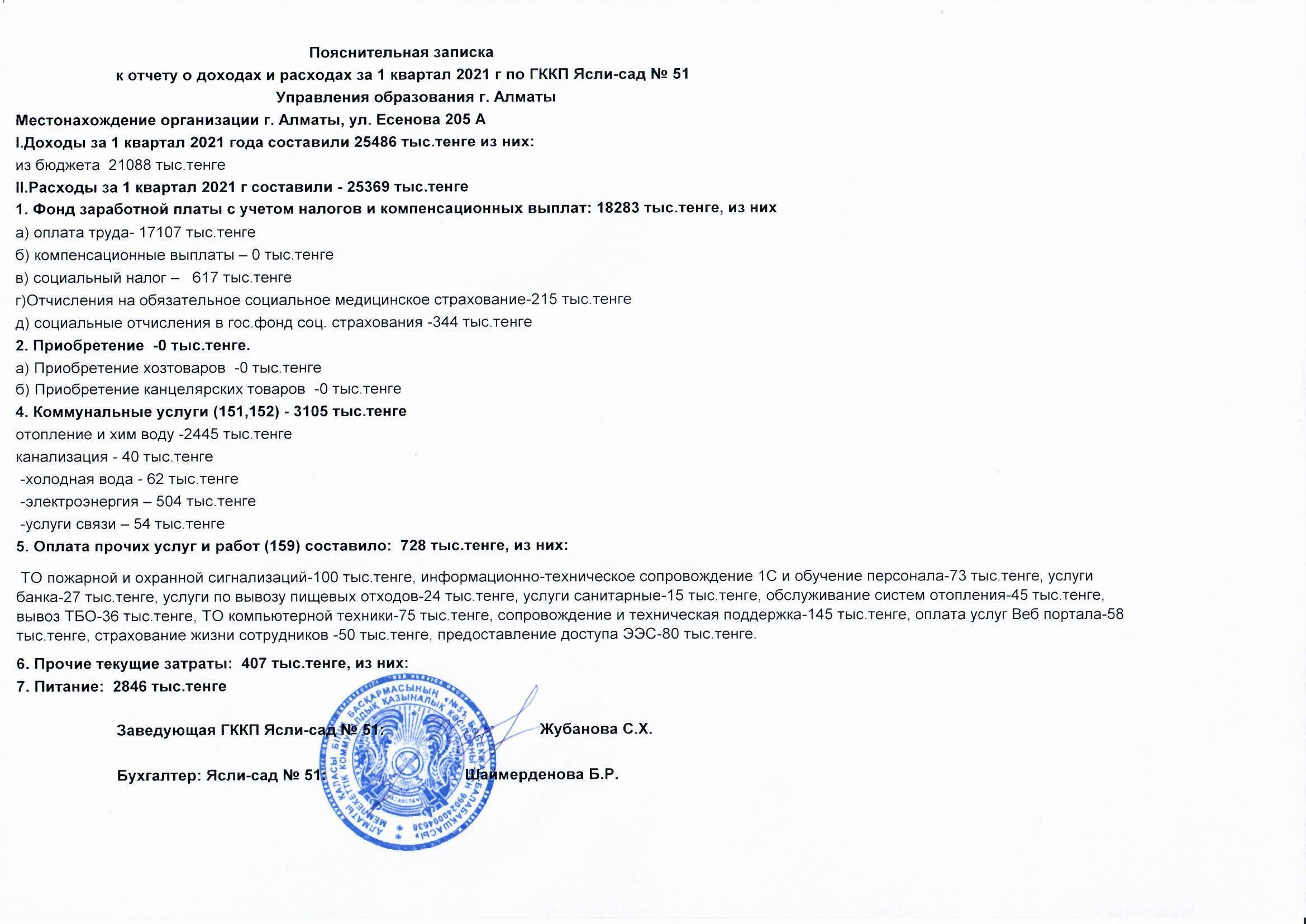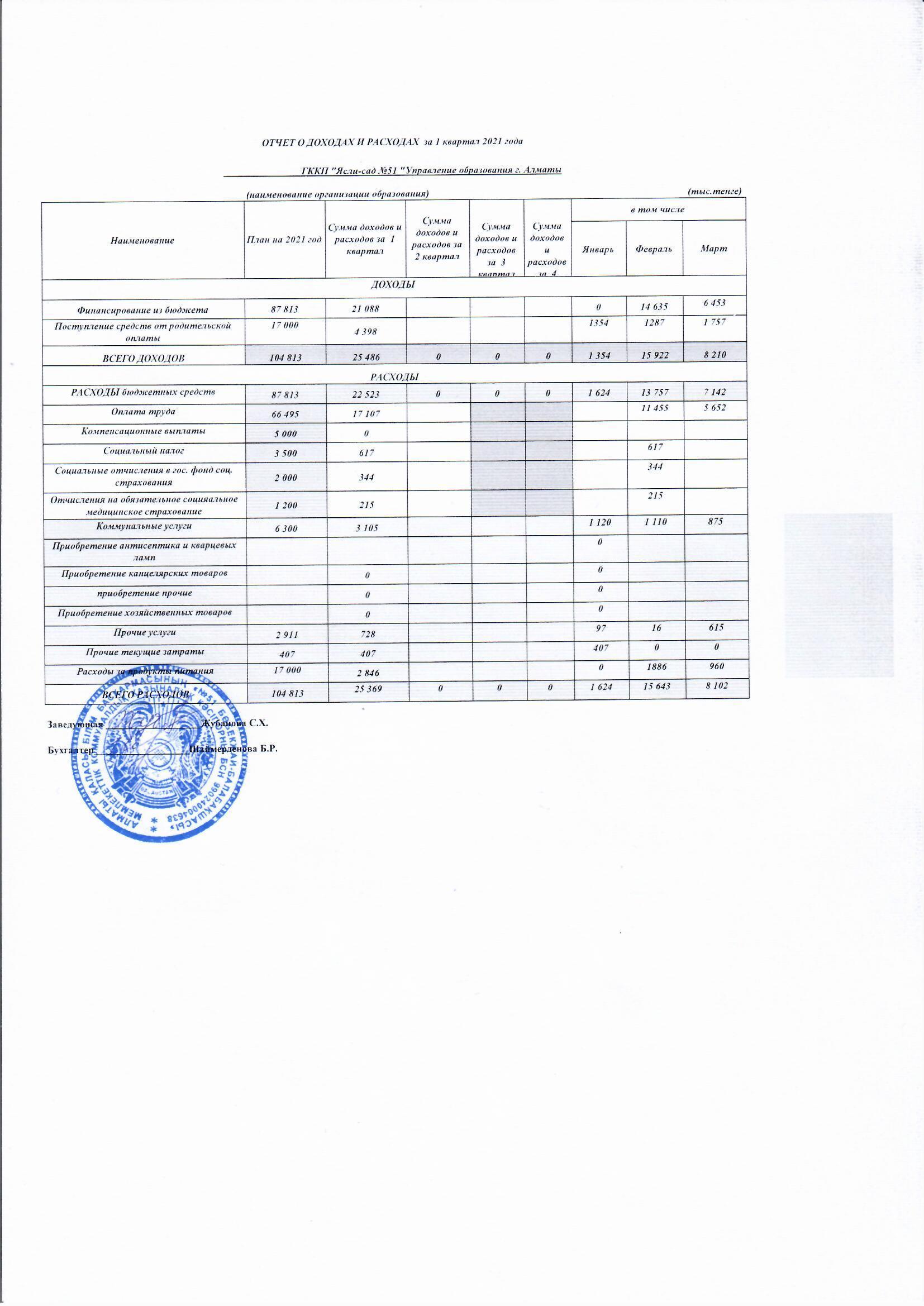Отчет о доходах и расходах за 1 квартал 2021 г. » МКҚК"№51 бөбекжай-балабақшасы"