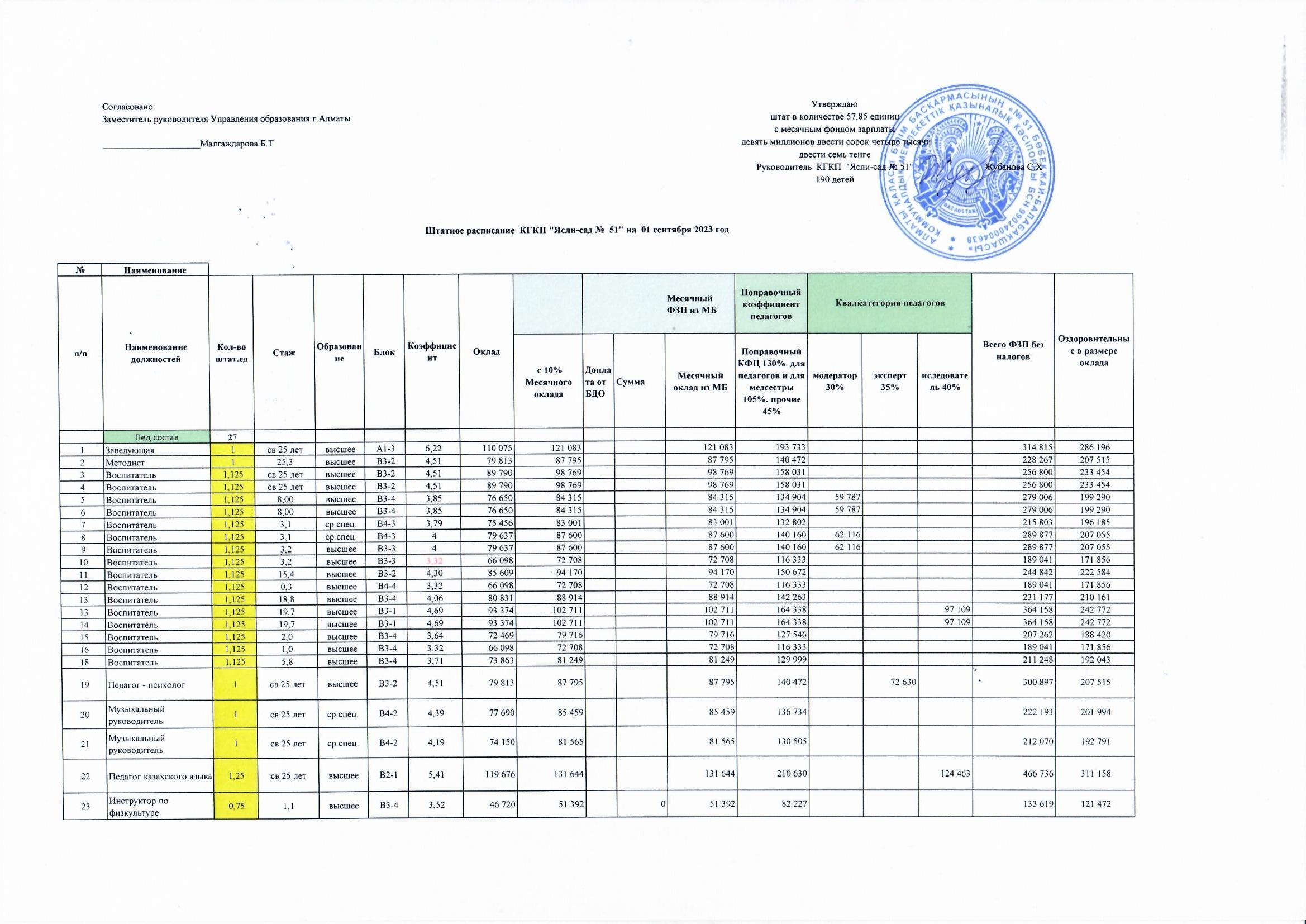 Штаттық кесте » МКҚК"№51 бөбекжай-балабақшасы"