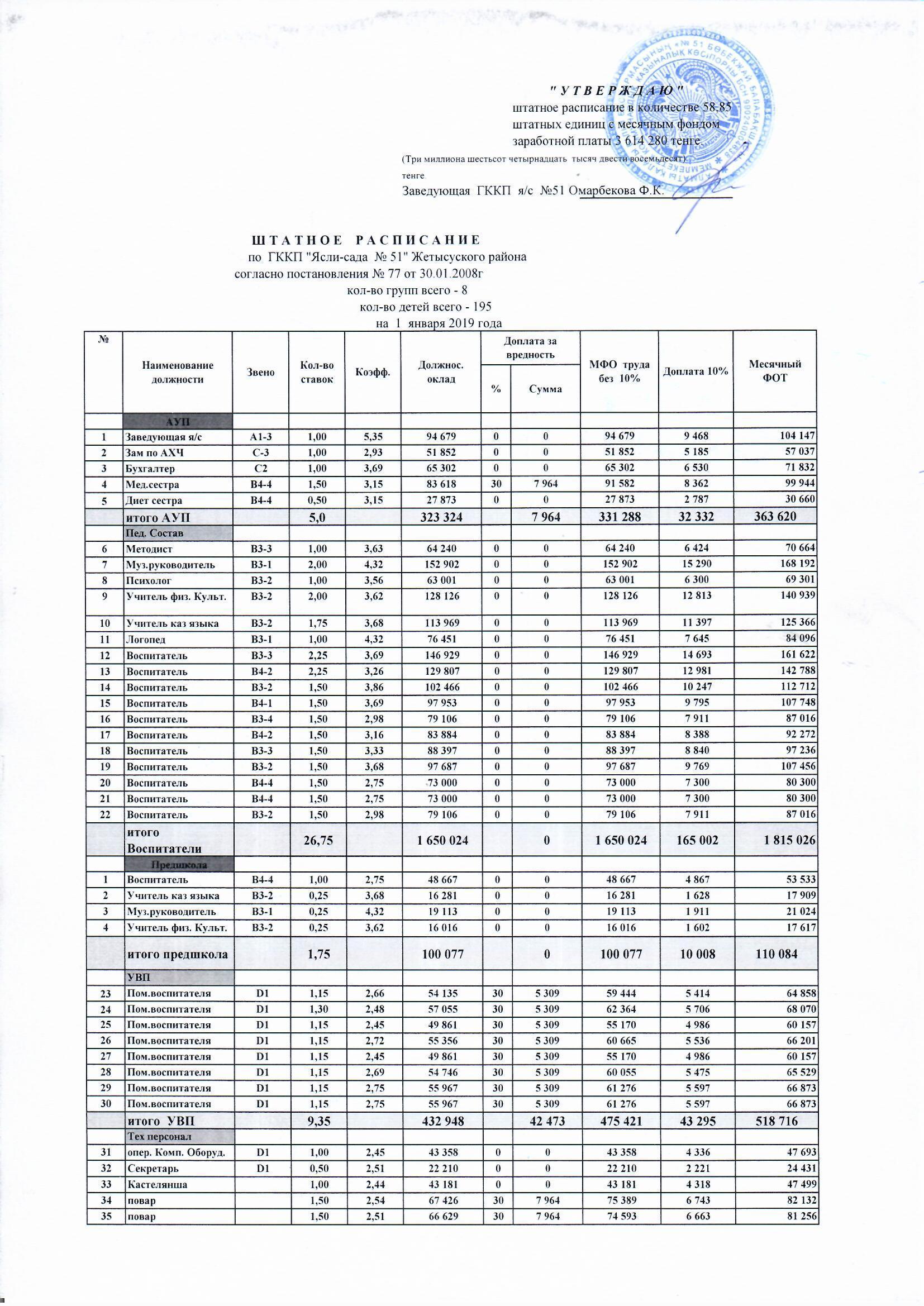 Штатное расписание на 2019 год » МКҚК"№51 бөбекжай-балабақшасы"