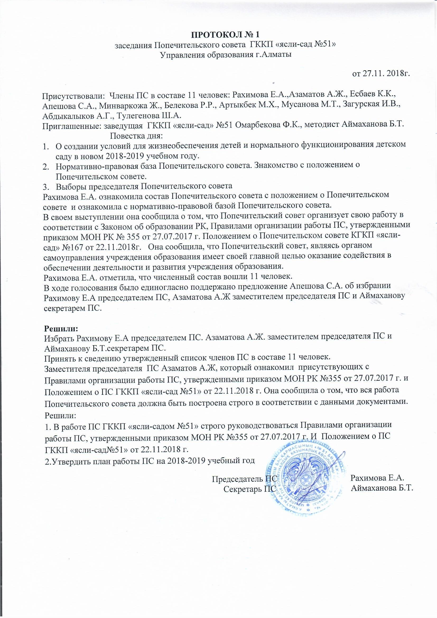 » » » Протокол заседания Попечительского ГККП "ясли-сад №51"