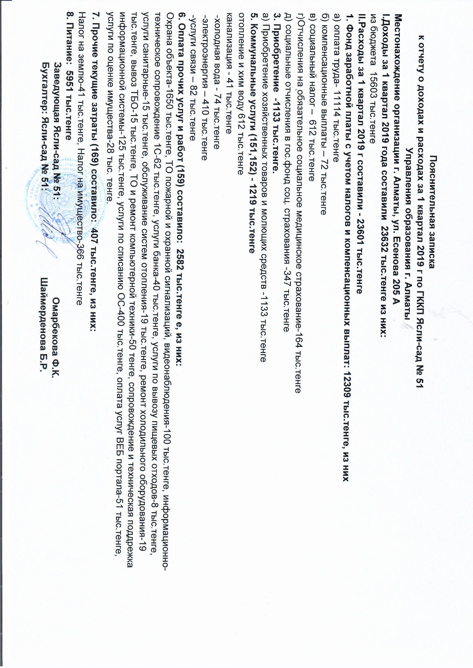 Отчет о доходах и расходах за 1 квартал 2019г. » МКҚК"№51 бөбекжай-балабақшасы"