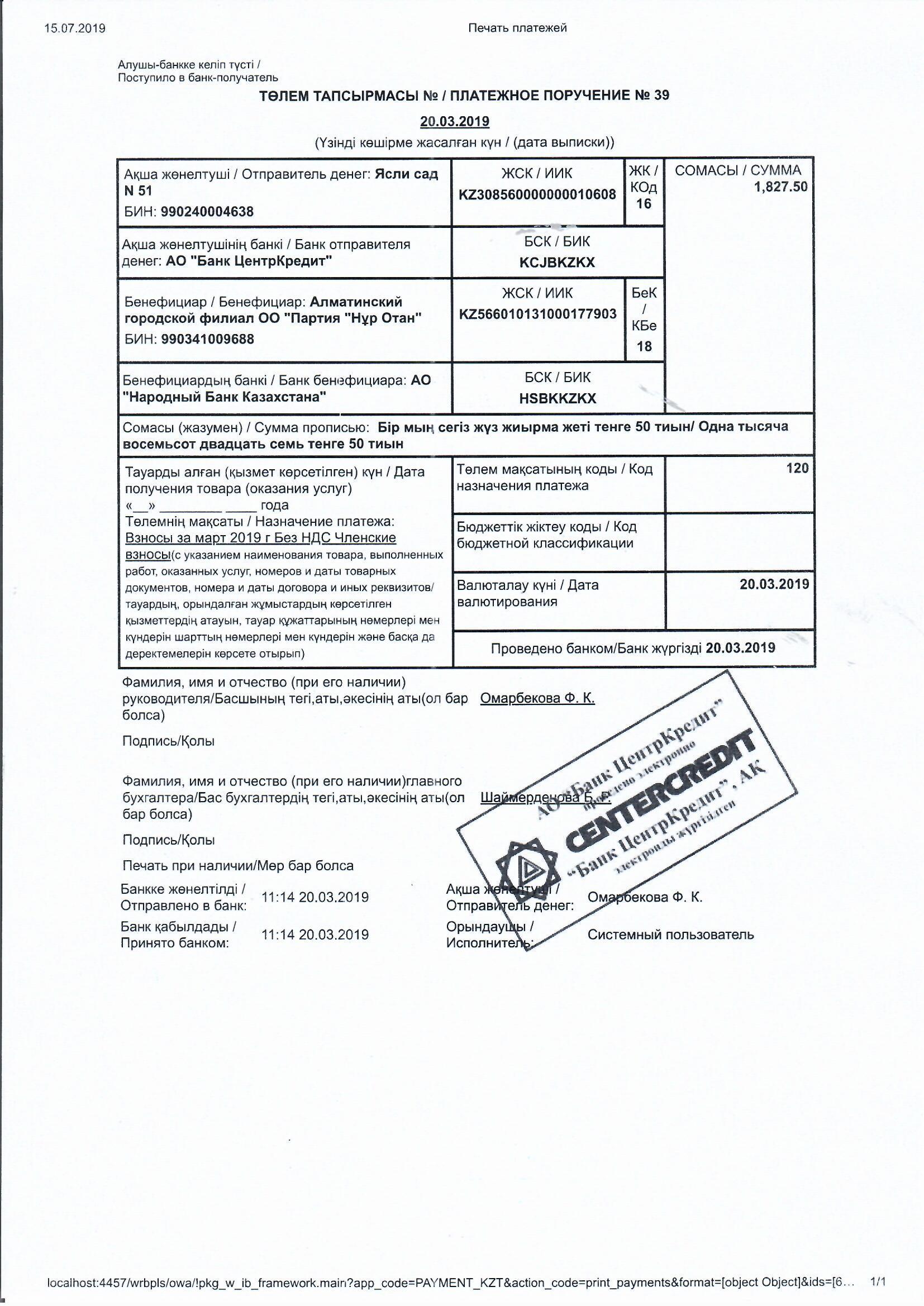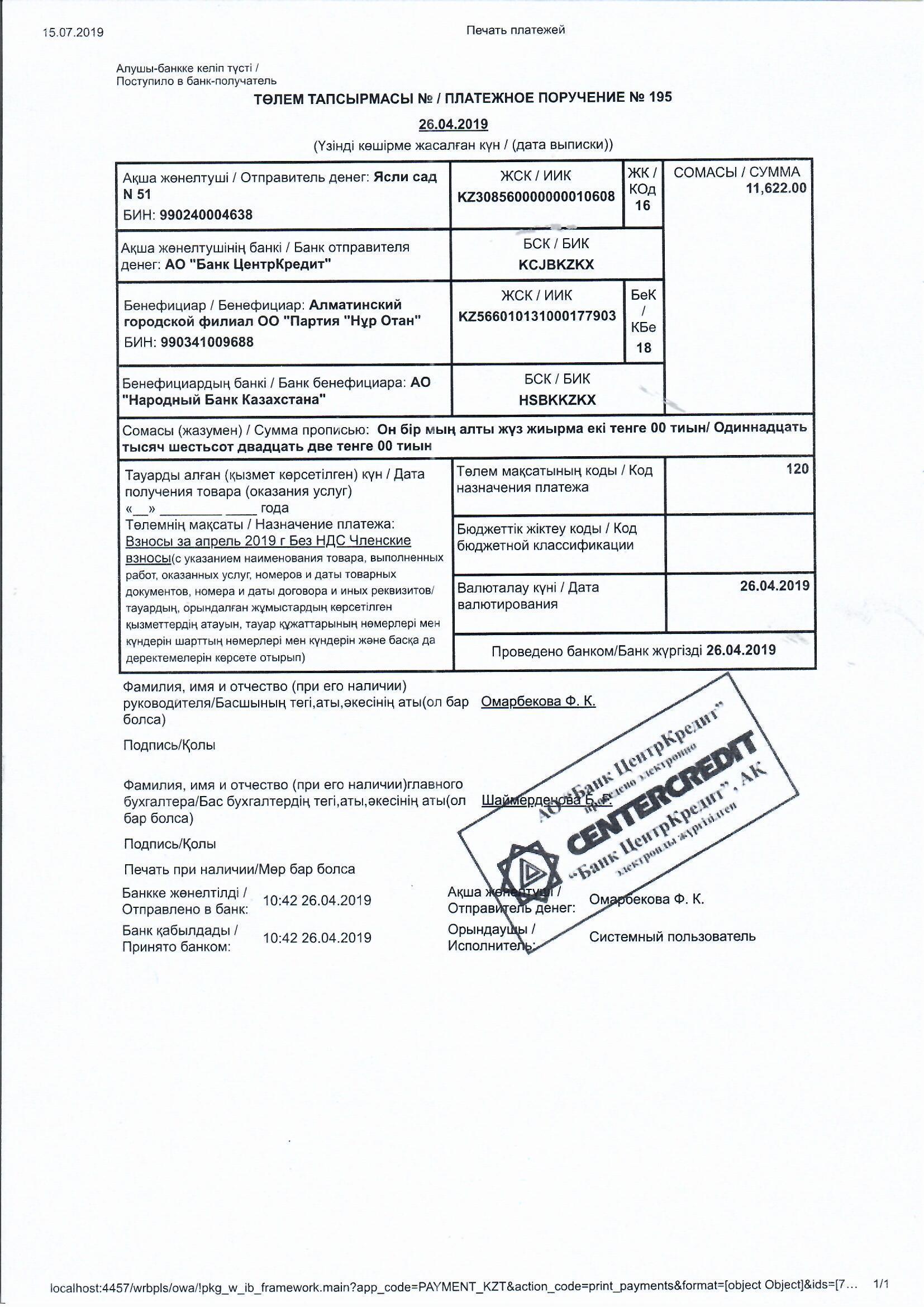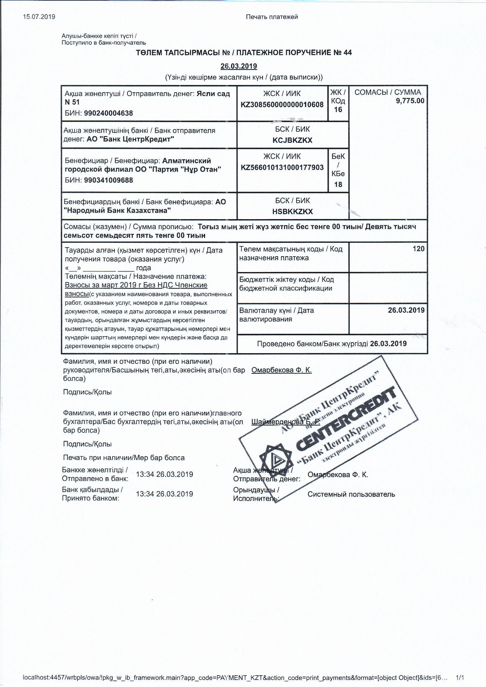 Платежные поручения за 2019 (с января по август 2019) » МКҚК"№51 бөбекжай-балабақшасы"