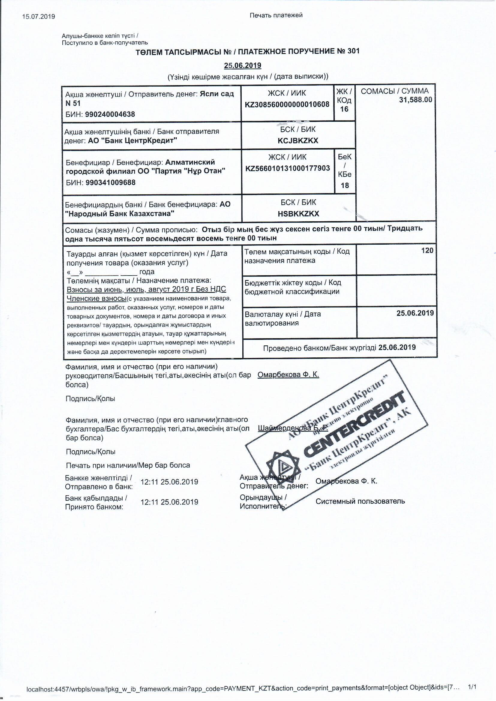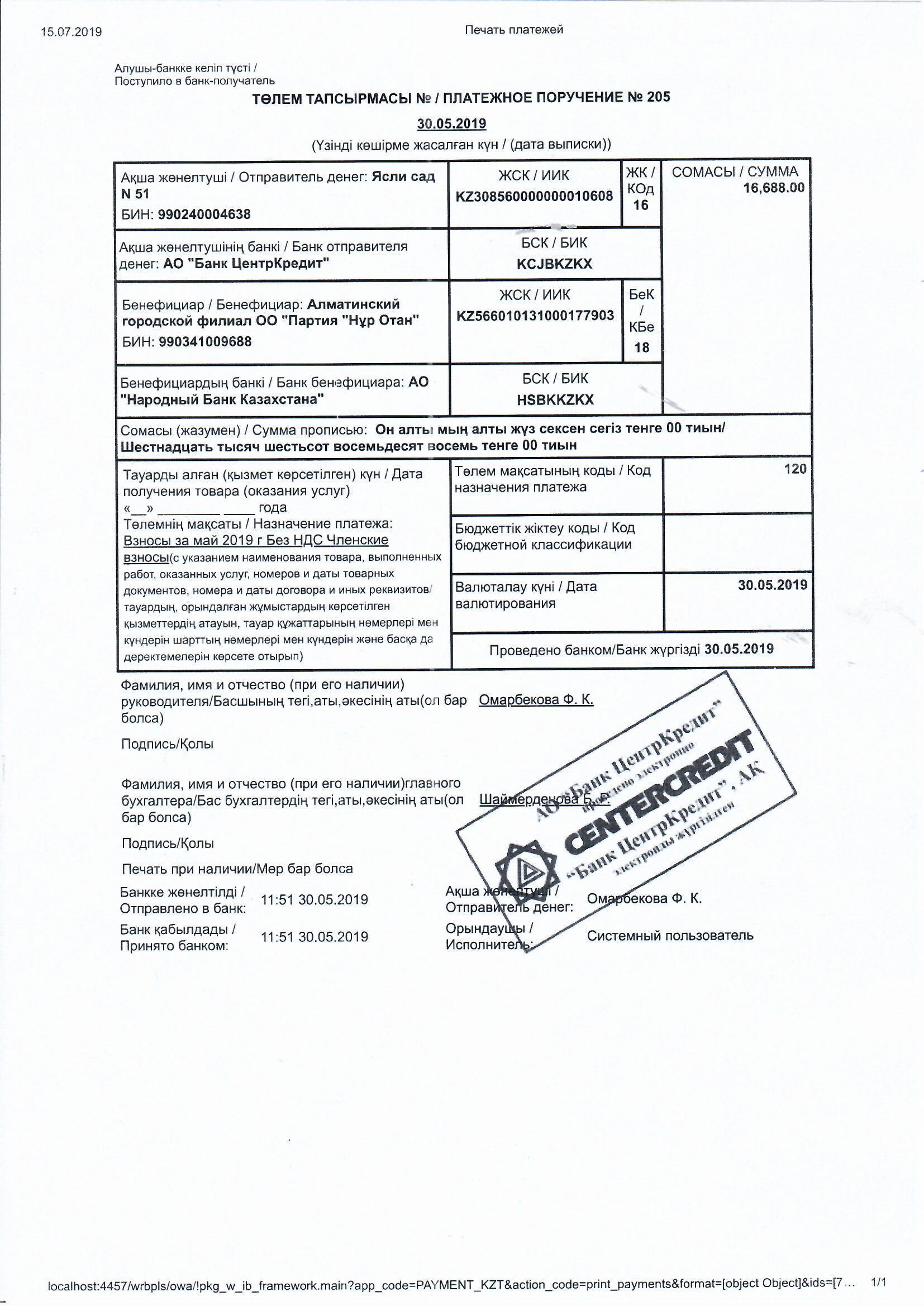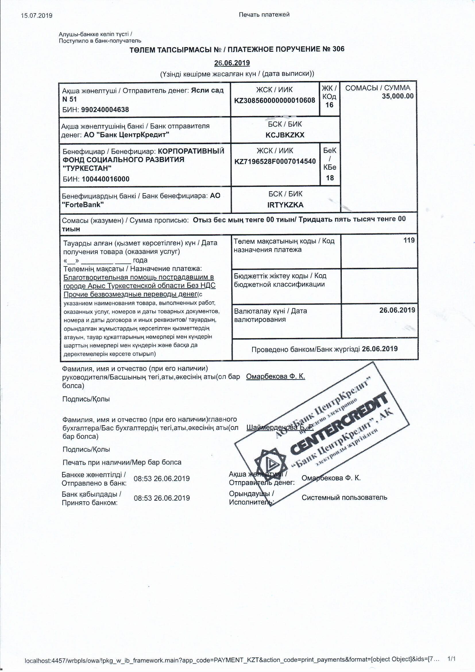 Платежные поручения за 2019 (с января по август 2019) » МКҚК"№51 бөбекжай-балабақшасы"